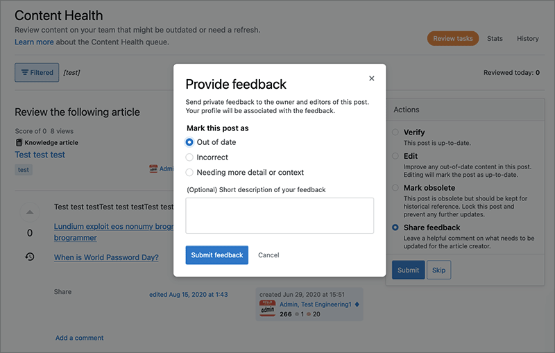 The Content Health feature automatically flags potentially out-of-date content for review and action. Administrators, Moderators, or users with reputation above the Access to Content Health threshold can access the Content Health Review Queue.