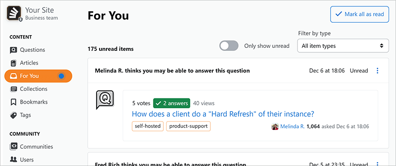 The Stack Overflow For You feature is a personalized, running feed of notifications, actions, and alerts for each user on the site. The For You page can help you get more from your Stack Overflow site in several ways: