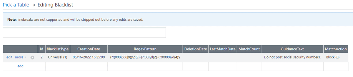 Any standard RegEx pattern will work in the Blocklist, but proceed with caution. Blocklist entries are active as soon as you submit them, so an improperly formed pattern could keep your users from submitting text anywhere on the site.
