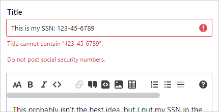 When Blocklist detects a prohibited string in the user's text entry, it will either warn the user or both warn and block the submission. In both cases, Stack Internal Enterprise displays the GuidanceText value.