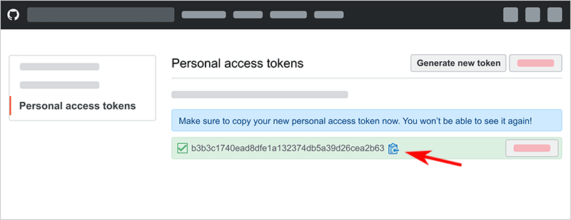 10. On the personal access tokens screen, copy the token. You won’t be able to see the token again after you leave this page. If you leave the page before copying the token, you'll need to create a new one.