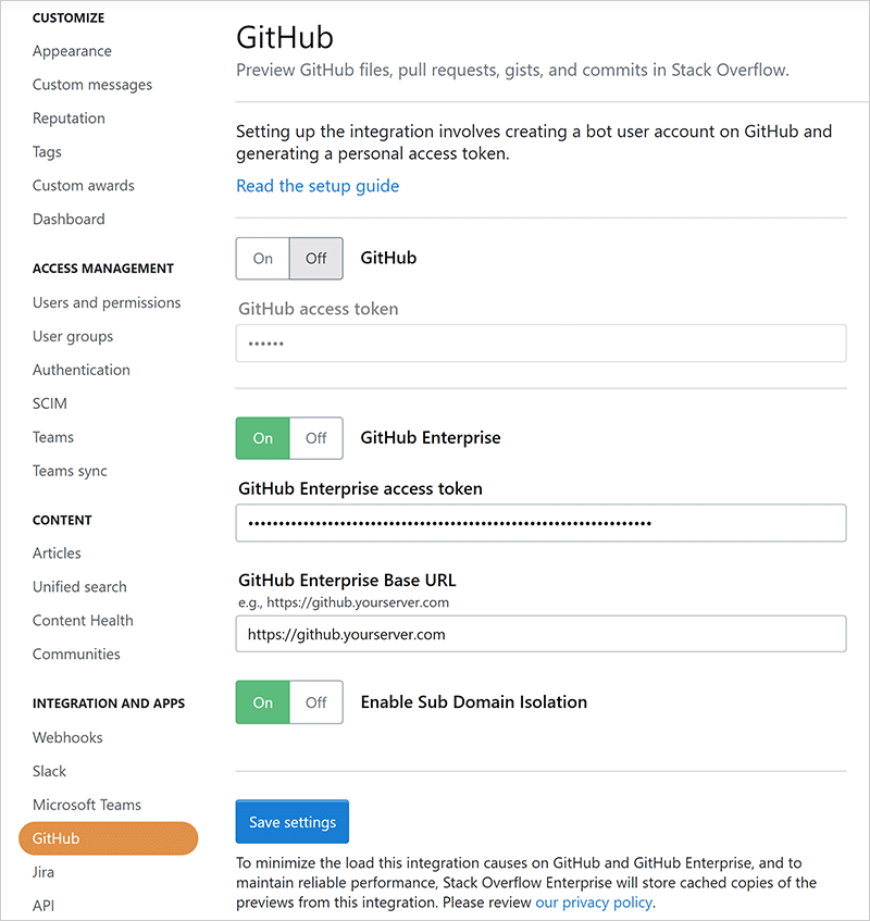 The GitHub integration requires a GitHub user to act as a bot account for the instance. You'll create a new GitHub bot user account for Stack Internal Enterprise and generate a personal access token for this user.