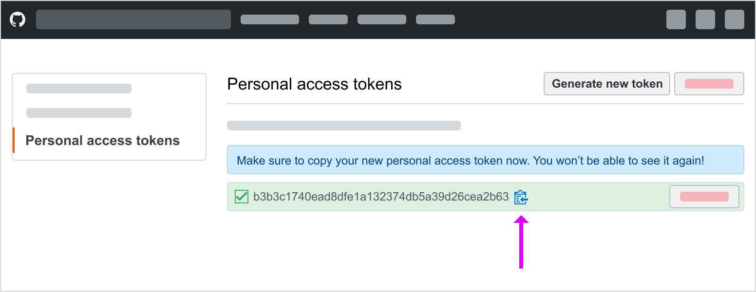 On the personal access tokens screen, copy the token. As GitHub mentions, you won’t be able to see the token again after you leave this page.
