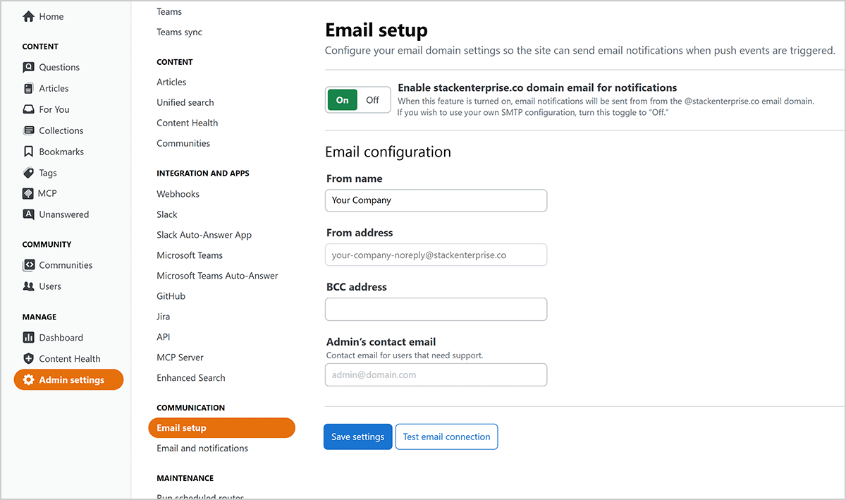 By default, hosted Stack Internal Enterprise sites will send email notifications from the @stackenterprise.co email domain. Site admins can also configure email settings to send emails from their own SMTP server.