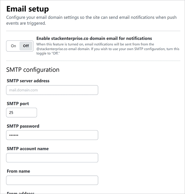 Below is a list of fields available for configuration, some of which are hidden when using the default hosted SMTP email setup (Enable stackenterprise.co domain email for notifications is On).