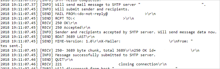 Once you've saved these settings, click Test email connection. This will trigger a test email to the email address associated with your account. This page will show you the communication log between the application and the SMTP server that you configured.
