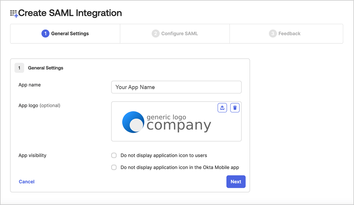 The following steps allow for manual configuration of Okta SSO. Use this process if you can't (or choose not to) access the Okta App Integration Catalog, or need to add the user job title and department data fields.