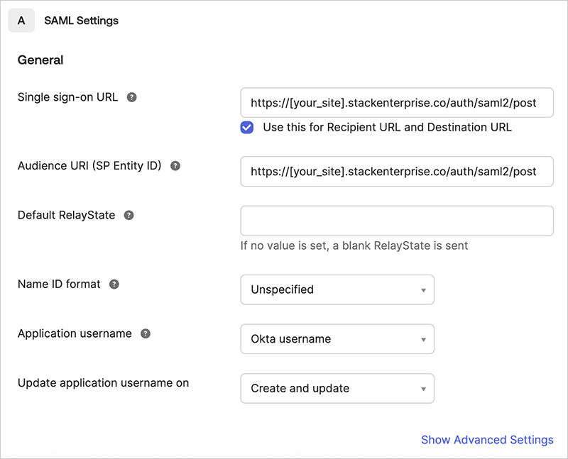 - Audience URI (SP Entity ID) Enter any unique value. We suggest using your Stack Internal Enterprise SAML URL (same as above: https://[your_site].stackenterprise.co/auth/saml2/post).