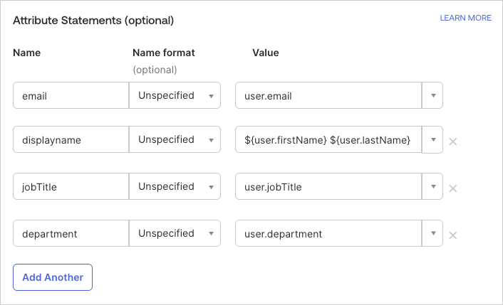 - Fill in the Name value from the Okta "Attribute Statements" tab for each of the following: