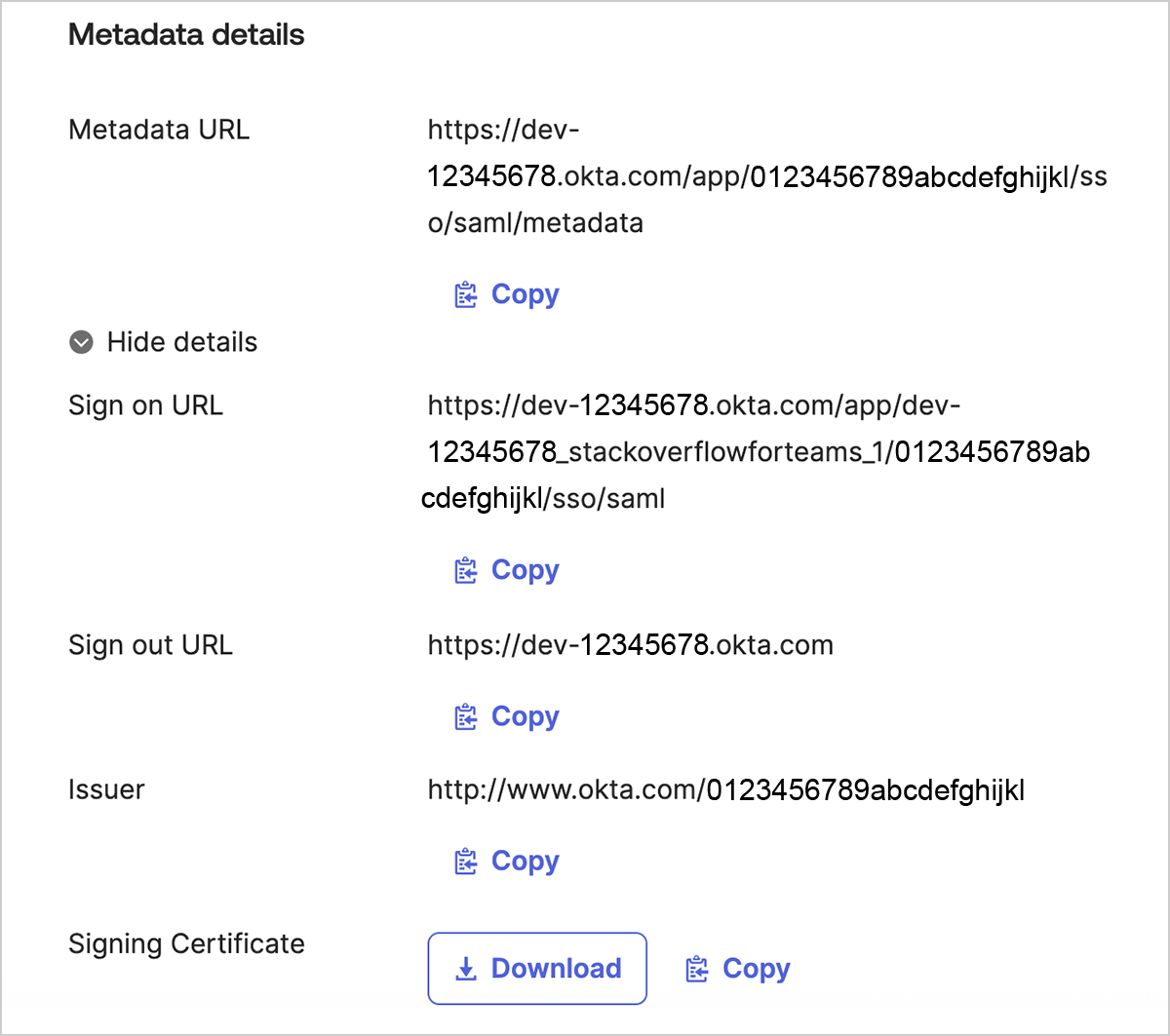 On Okta's "Sign On" tab, use the Copy links to add the following values to your Stack Internal Enterprise settings. If you see a setting that's not listed here, leave it unchanged.