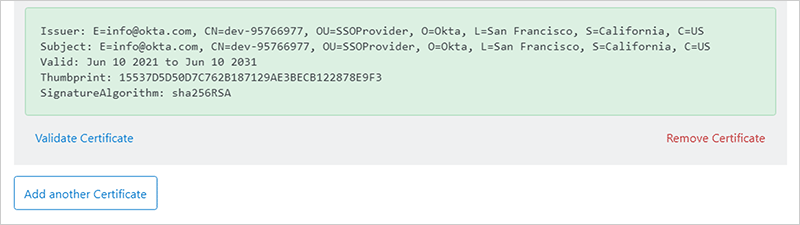 - Identity provider certificates Click View SAML setup instructions in the bottom right corner of the "Sign On" tab. Copy the entire value shown in the X.509 Certificate field and paste it here.