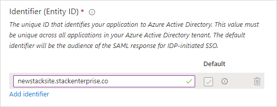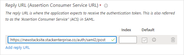 Your site has a pre-configured SAML authentication URL: https://[your site]/auth/saml2/post. Replace [your site] with your actual Stack Internal Enterprise URL, and enter it into the Reply URL field. The URL must start with "https://". For example: https://newstacksite.stackenterprise.co/auth/saml2/post.