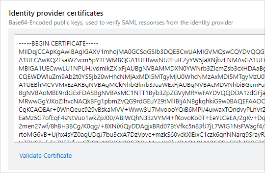 Open the certificate file you downloaded from Entra ID in a text editor. Copy and paste the contents of the file into the Identity Provider Certificates box, including "-----BEGIN CERTIFICATE-----" and "-----END CERTIFICATE-----".