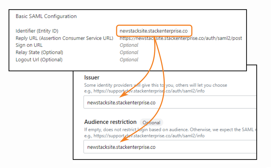 Copy the Identifier (Entity ID) value from the Entra ID "Basic SAML Configuration" box and paste it into the Issuer and Audience restriction fields.