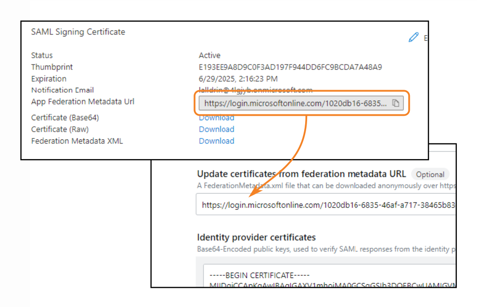 NOTE: Though the Update certificates from federation metadata URL field shows "Optional", it is required for Entra ID. Because Microsoft frequently rotates certificates, your users will be unable to log in if this URL is not set.