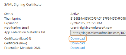 In the SAML Signing Certificate section, locate "Certificate (Base 64)" and click its Download link. Save the certificate file on your computer.