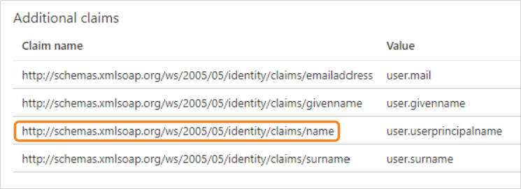 - In the "Additional claims" area, locate the entry with a value of user.principalname.