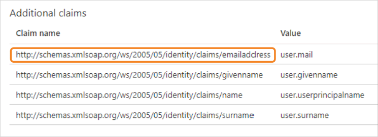 - In the "Additional claims" area, locate the entry with a value of user.mail.