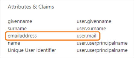 emailaddress(user.mail) attribute. If that attribute is missing, your Entra ID authentication will fail. Reach out to Stack Overflow support if you don't see the email address attribute listed.
