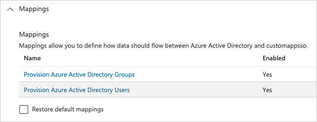 1. Go to the Entra ID application's "Mappings" page. Set mapping at the user level by clicking Provision Azure Active Directory Users. Entra ID SCIM does not support user group management.