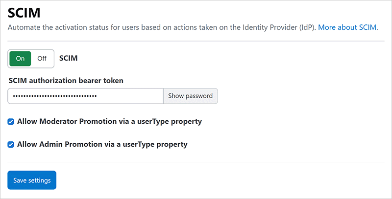 - Allow Moderator Promotion via a userType property Check this box to enable SCIM promotion/demotion between regular user and moderator roles.