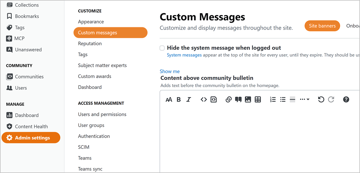 The Custom Messages and System Messages features allow site administrators to create, customize, and manage various messaging elements across their Stack Internal Enterprise site. This makes it easy to reach your users in your way, with everything from system alerts to onboarding messages.