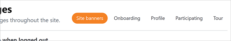 The Custom Messages page allows you to craft your own messages in five areas: site banners, onboarding, profile, participating, and tour. To access each of these areas, click the corresponding button in the upper-right corner of the page.