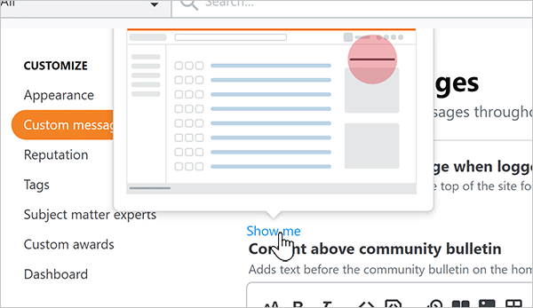 NOTE: Many custom messages have a Show me link. Click this to see a thumbnail that shows where the message will appear on your site.