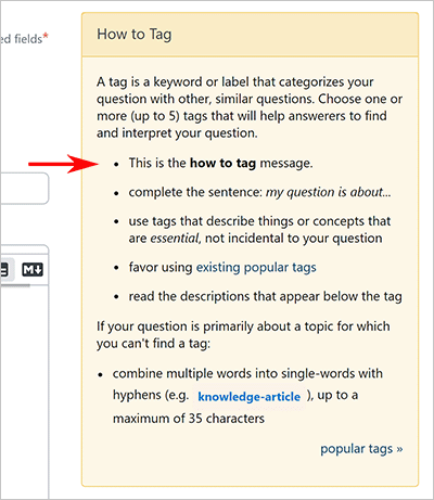 Use this message to customize the first bullet prompt in the How to Tag sidebar. Users see this sidebar when adding tags to a new question.