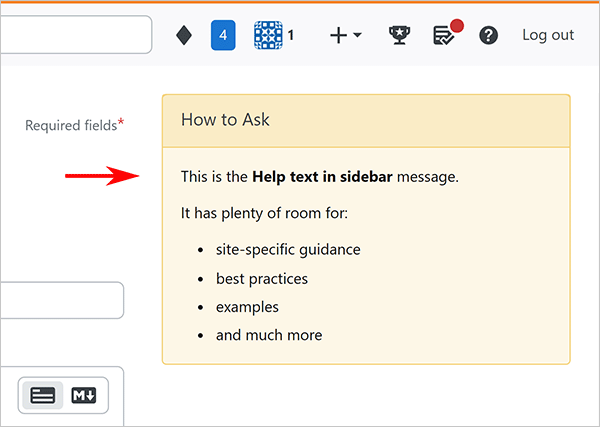 Use this message to add site-specific guidance for your users to craft better questions. The How to Ask sidebar sits on the new question page and has lots of room, so you can be generous with advice for your users.