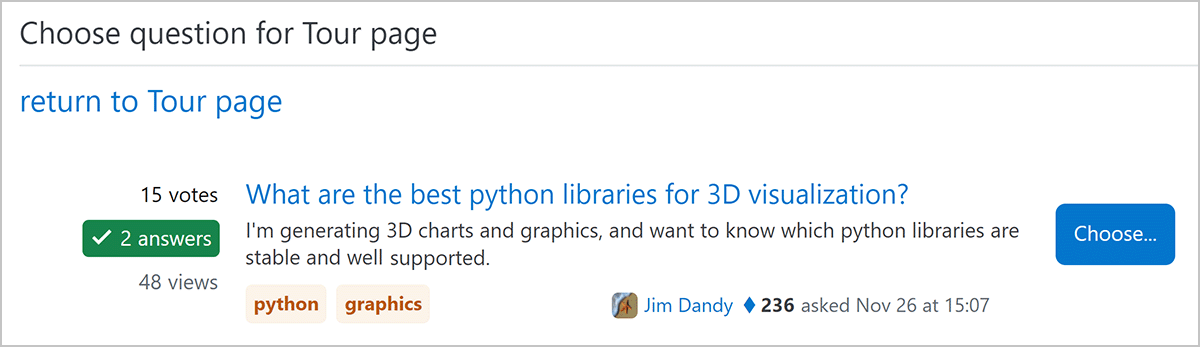 When you find a suitable question, click Choose to see a preview of how the question will look on the tour page. To confirm, click Use this question for the tour page.