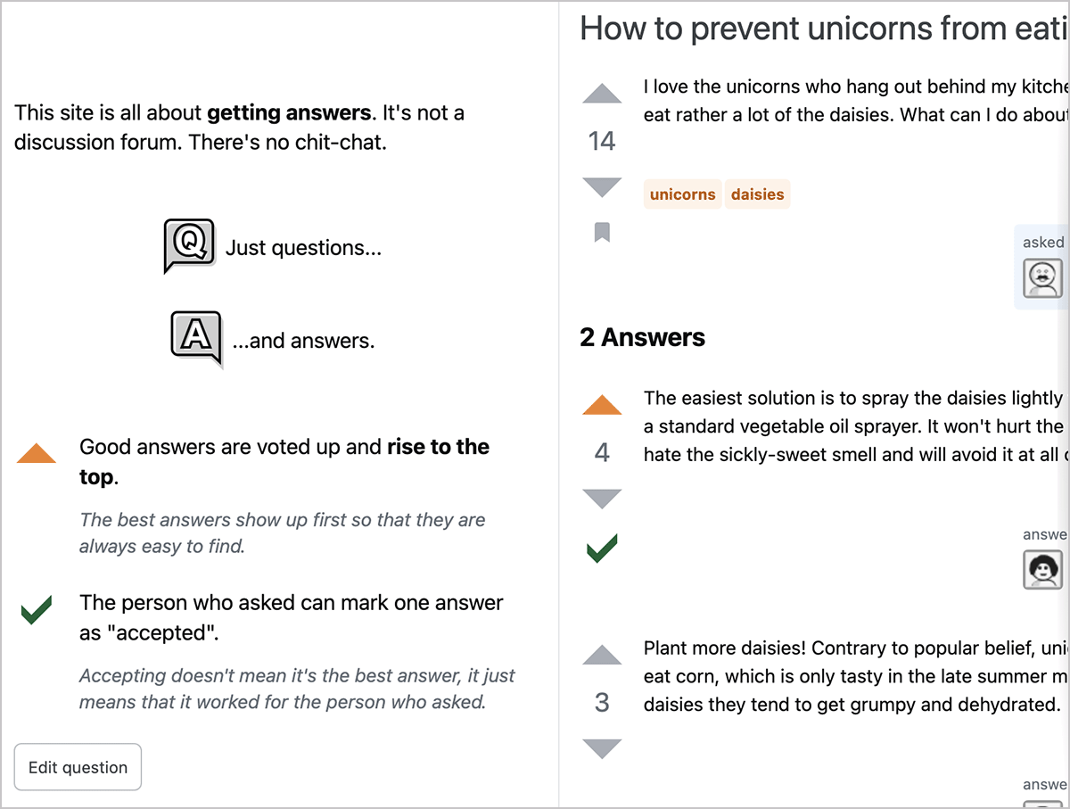 If in the future the chosen example question no longer meets the requirements and any additional rules (such as character limit or block element), it will no longer show on the tour page. The tour page will revert to showing the default unicorns example question.