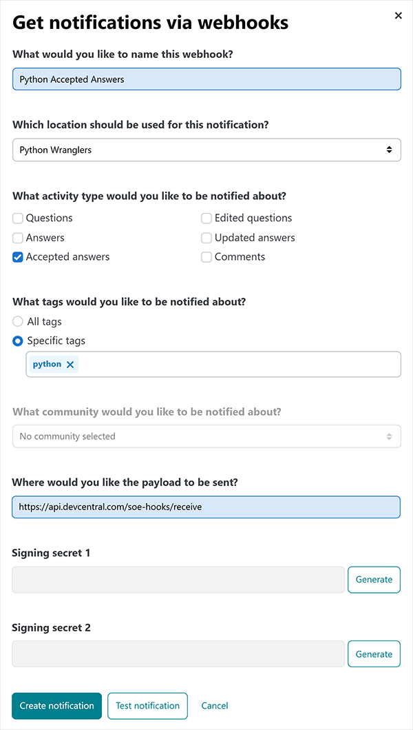- What community would you like to be notified about? If you'd like webhook notifications only for a specific Community, select it here.