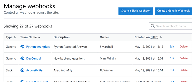 NOTE: If Stack Internal Enterprise detects a problem with a webhook, it will display that webhook in gray. The Edit and Delete links still work, allowing you to troubleshoot or delete the nonfunctional webhook.