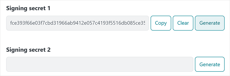 - Signing Secret 1 and Signing Secret 2 Click Generate to generate a signing secret for the webhook payload. Click Copy to copy a secret to your clipboard, or Clear to delete it.