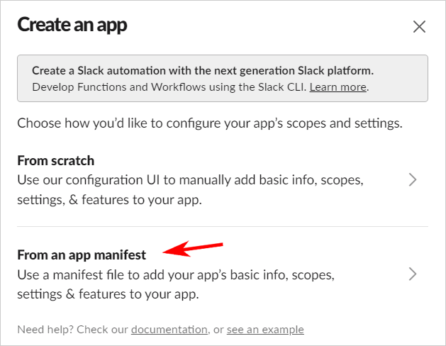 In Slack, go to the Slack Apps page and click Create New App. Select From an app manifest.