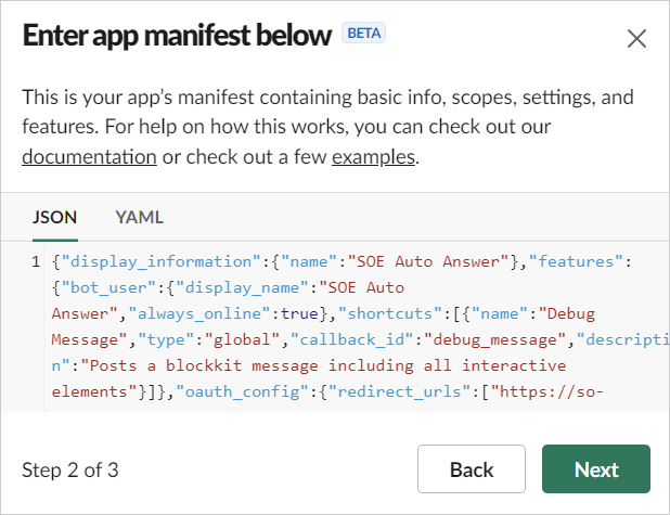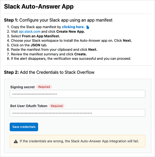 In Stack Internal Enterprise, click Admin settings in the left-hand menu, then click Slack Auto-Answer App. In step 1 of the "Step 1" section, click ...clicking here... to copy the JSON manifest to your clipboard.