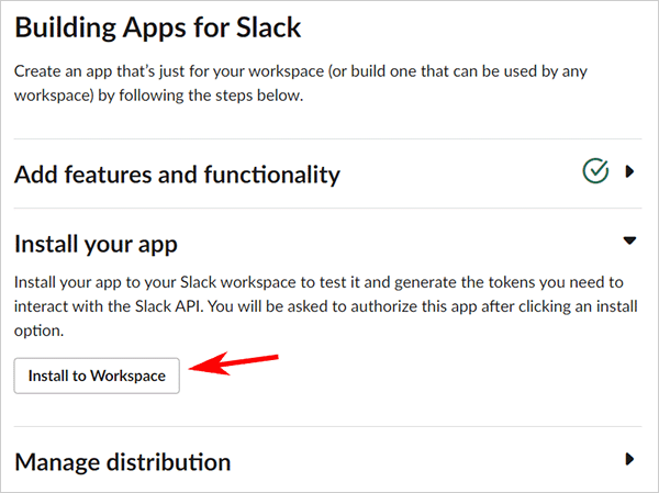 After creating the app, you'll see the app's configuration page. Click Install to Workspace.