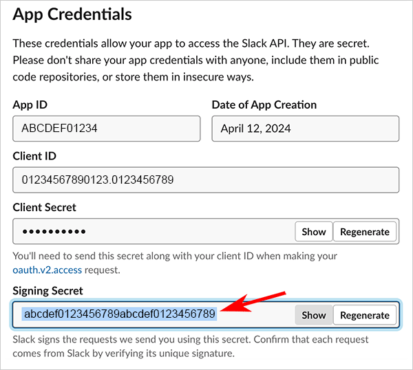 From your Slack App’s Basic Information tab in the left-hand menu, click Show for the Signing Secret and copy the value to your clipboard.