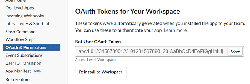 Return to your Slack app and click OAuth & Permissions in the left-hand menu, then copy the Bot User OAuth Token value to your clipboard.