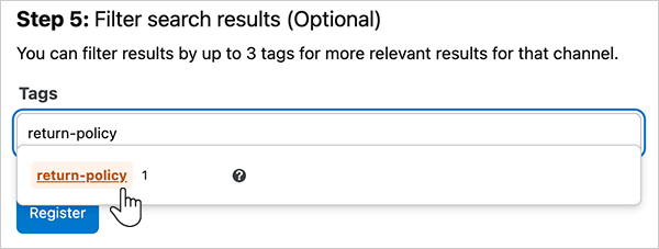 In the "Step 5" section, you can add tags to focus Auto-Answer App searches. The app will only return content that has at least one of the tags listed. Type into the Tags box to search for and add up to three tags that already exist on your Stack Internal Enterprise site.