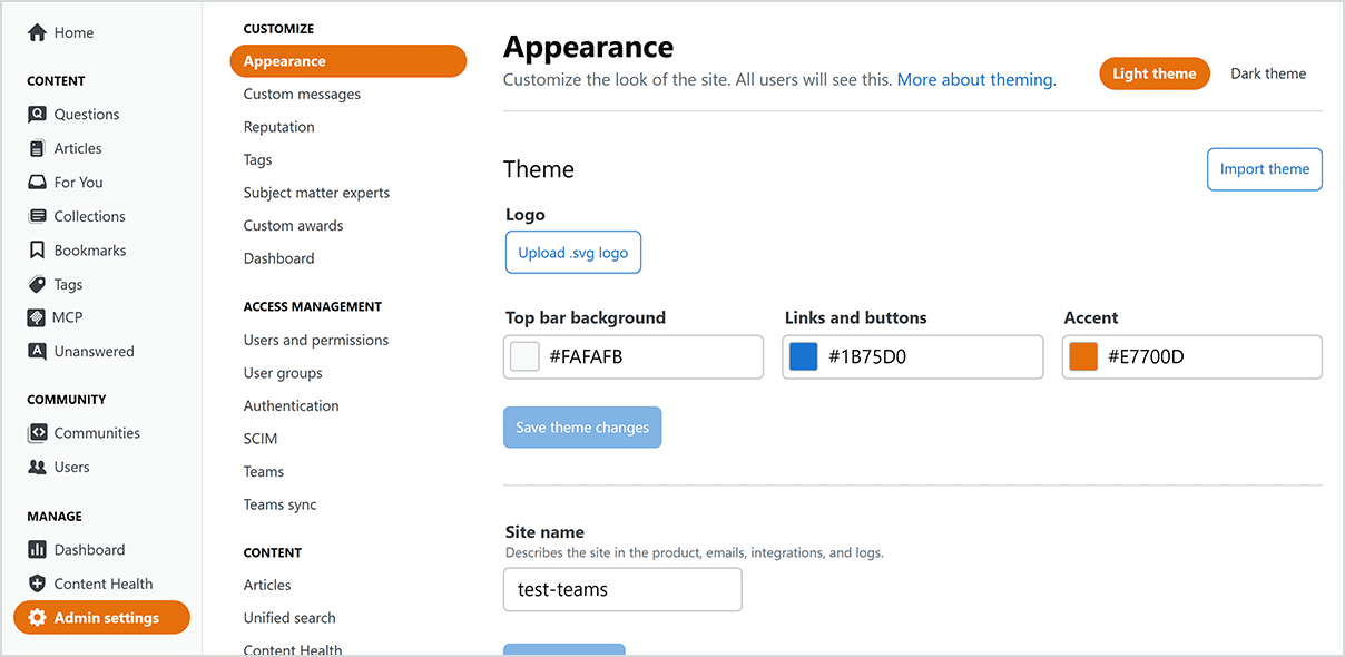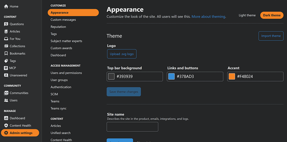 You can access the customization options by clicking Admin Settings in the left-hand menu, then Appearance. You can set alternate light and dark theme colors and logo by clicking the Light theme and Dark theme buttons at the top of the page.