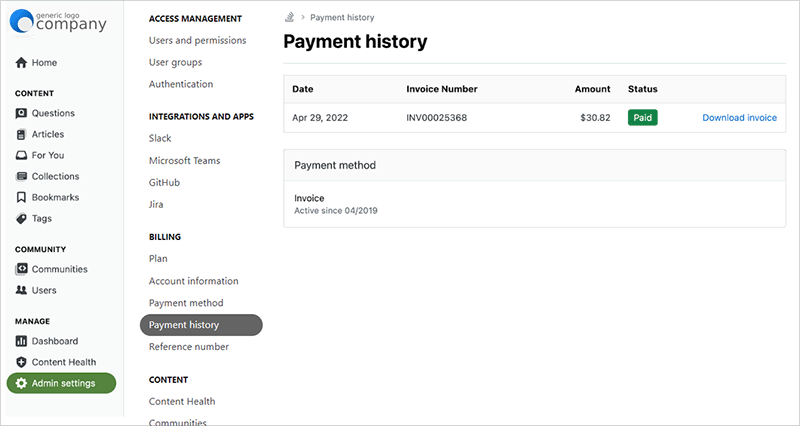 If you wish to review your current and past payment history, visit Payment history under the Billing section of Admin settings.