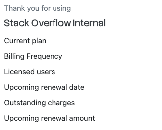 If you wish to review your current subscription details and other available Stack Overflow Internal subscription plans, visit the Plan tab under the Billing section of Admin settings.