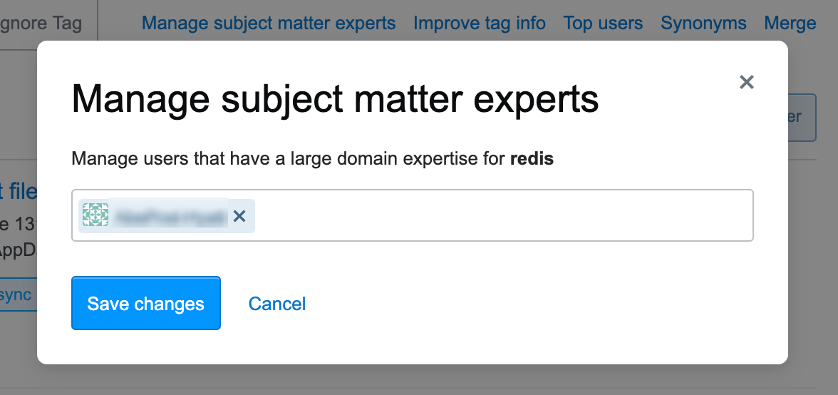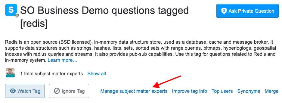 To assign an SME, team admins can click Tags on the left sidebar, then any specific tag. From a tag page, click on Manage subject matter experts.