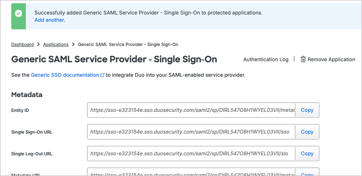 - Single sign-on service URL Copy the Single Sign-On URL value from Duo Security and paste it here.