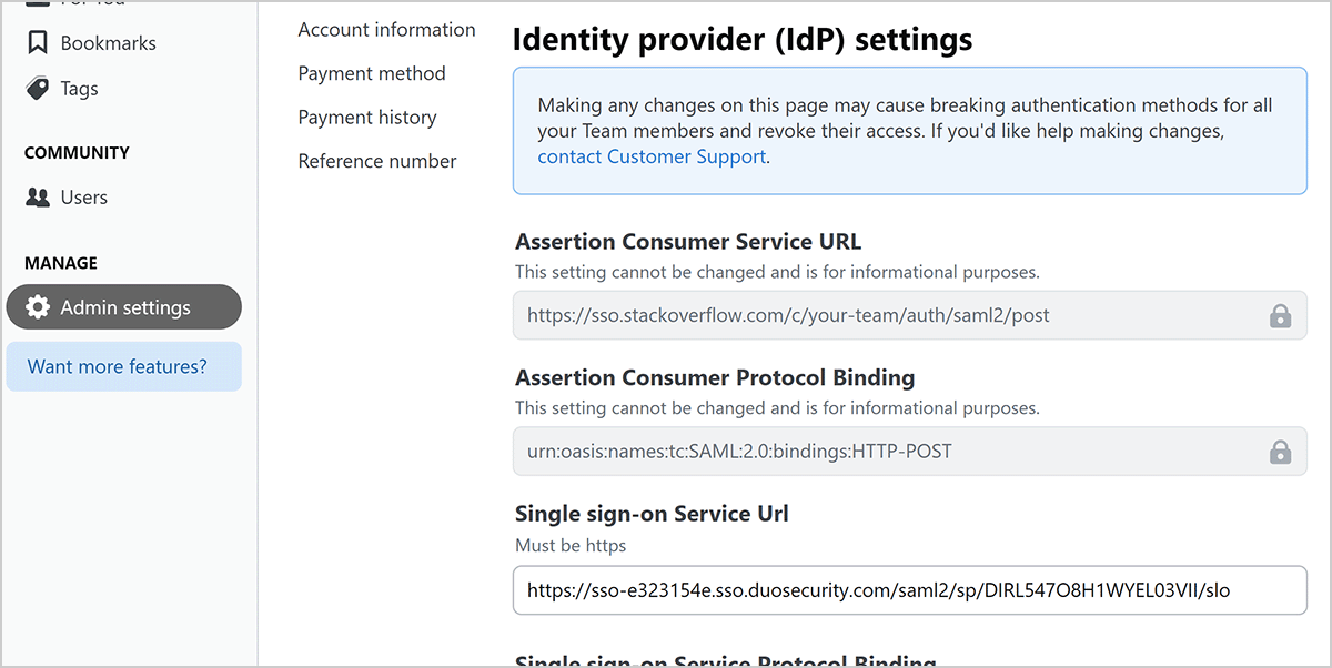 When setting up SAML authentication, you'll configure your Stack Overflow Internal site and Duo Security in a back-and-forth process. We recommend having a browser tab or window open to each site.