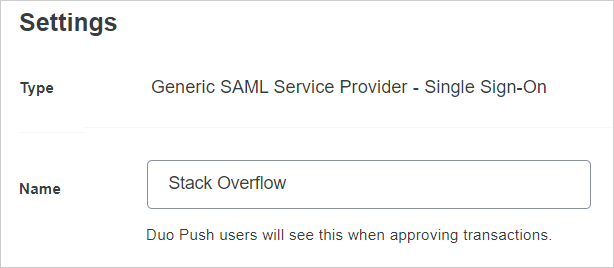 To make the login process clearer to your users, assign a name to the application (for example: Stack Overflow). Users with Duo Push two-factor authentication will see the application name.