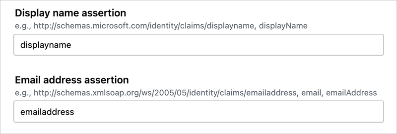 In Stack Overflow Internal, copy and paste the SAML response attributes from Duo into the corresponding Display name assertion and Email address assertion fields.