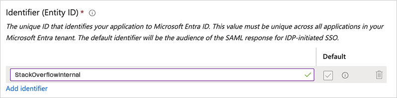 Must be unique per application. We recommend you set this field to "StackOverflowInternal". Later, you'll enter this value into your Stack Overflow Internal auth settings as Issuer and Audience Restriction. Be sure the Entity ID checkbox for Default is checked.